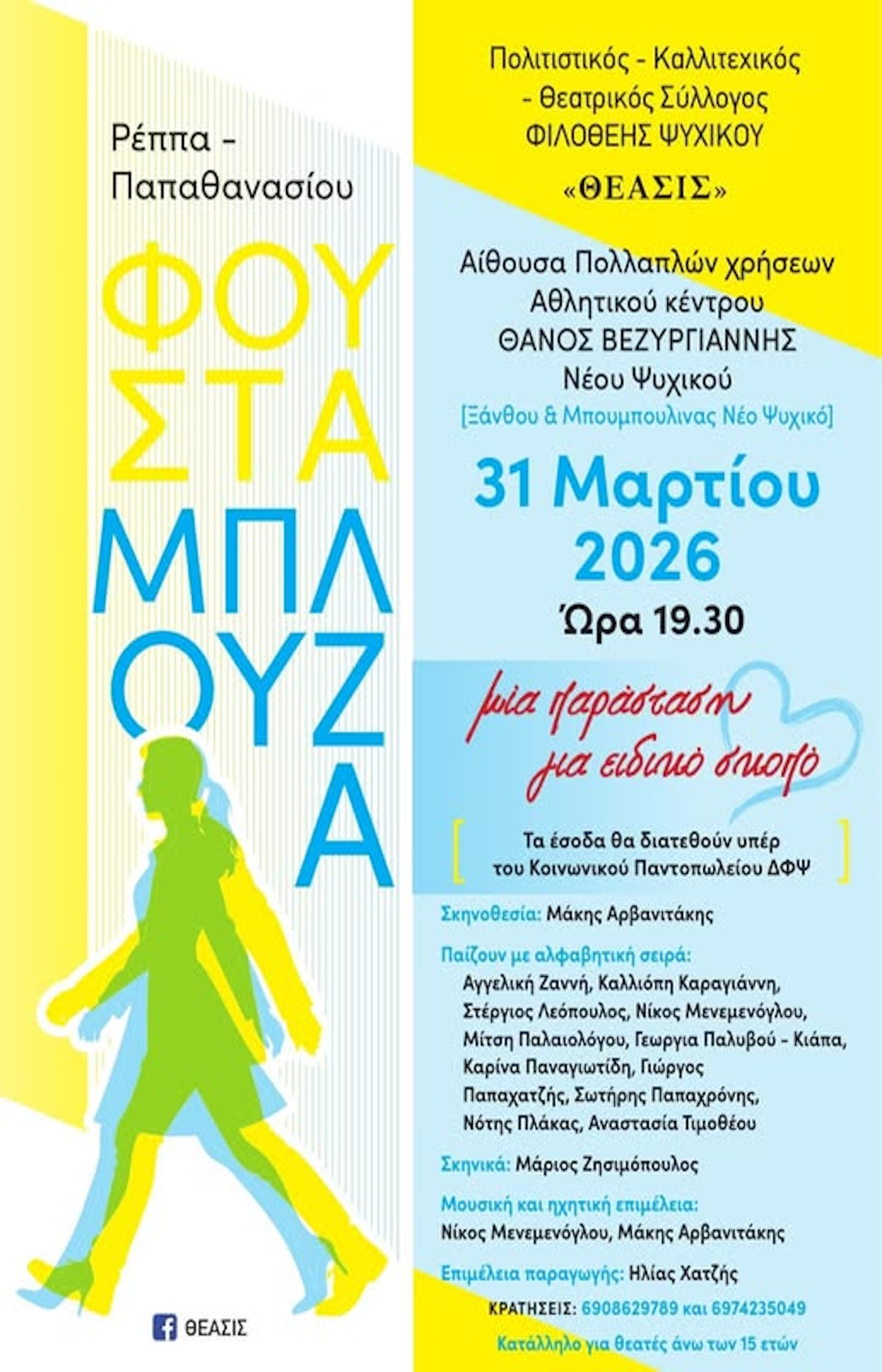 Το Δ.Σ. της ΘΕΑΣΙΣ αποφάσισε να παρουσιάσει μια ακόμα φορά την επιτυχημένη παράσταση ΦΟΥΣΤΑ-ΜΠΛΟΥΖΑ των Ρέππα-Παπαθανασίου στις 31 Μαρτίου 2026 στις 19.30 στο αθλητικό κέντρο Νέου Ψυχικού "Θάνος Βεζυργιάννης"