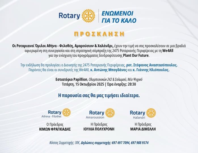 Οι Ροταριανοί Όμιλοι Αθήνα-Φιλοθέη, Αμαρουσίου και Χαλανδρίου έχουν την τιμή να σας προσκαλέσουν σε μια βραδιά αφιερωμένη στη συνεργασία και στη στρατηγική σύμπραξη της 2475 Ροταριανής Περιφέρειας Ελλάδος με την We4All για την ενίσχυση του προγράμματος δενδροφύτευσης.